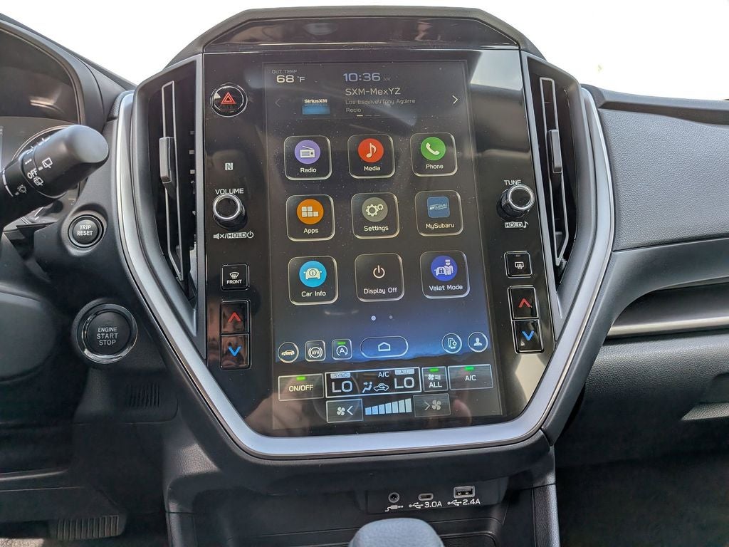 - Radio: Subaru 11.6" Multimedia Plus System -inc: valet mode, AM/FM stereo, HD Radio, multi-touch gesture high resolution display screen, voice activated controls, Bluetooth® audio streaming and hands-free phone connectivity, Bluetooth® hands-free SMS text messaging connectivity, iPod control capability, smartphone integration: wired and wireless Android Auto w/full screen view, wireless Apple CarPlay w/full screen view and wireless connection, USB and Over The Air (OTA) audio system update, audio system and Bluetooth® steering wheel control switches, 6 speakers (2 dash panel tweeter, 2 front door, 2 rear door), illuminated 3.5mm auxiliary input jack, illuminated USB A and C input charge ports, roof mounted satellite and connected services, roof mounted black antenna, connected services operation indicator, SOS emergency assistance (red button) and ehanced roadside assistance (blue i-button)